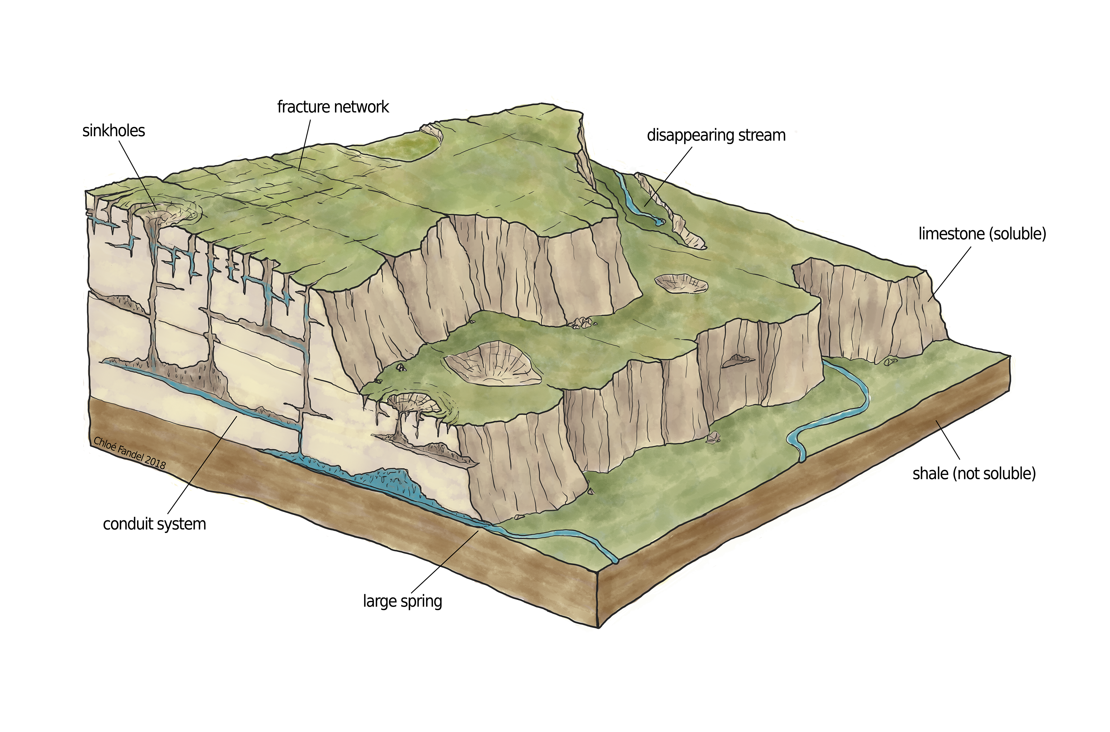 Common features in karst landscapes: sinkholes, solutionally-enlarged conduits, cave systems, disappearing streams, large springs.
